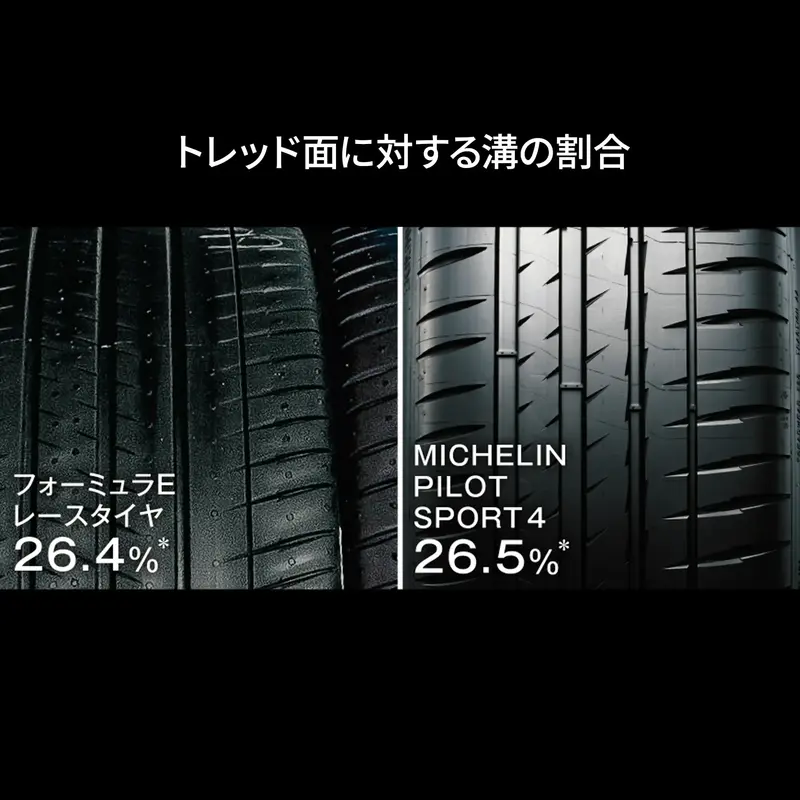 フォーミュラEでも使われるテクノロジーを採用。ウルトラ・リアクティブ・トレッドパターンは、フォーミュラEで磨かれたレースタイヤの技術を応用し、広い接地面を実現。トレッド面に対する溝の割合を抑えることで、路面をしっかりと捉え続ける。