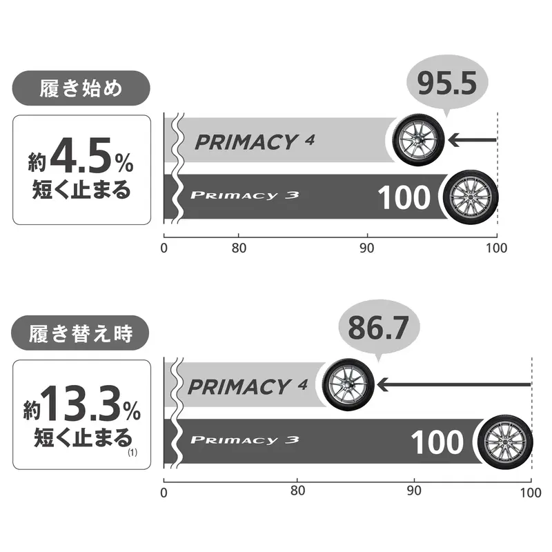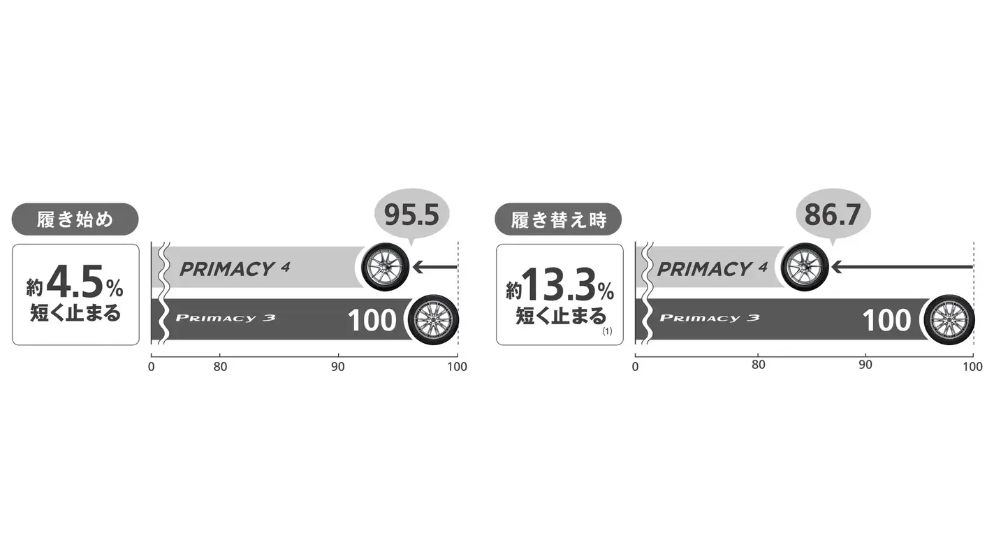 MICHELIN PRIMACY 3と比較して、履き替え時のウェットブレーキング性能が約13.3%アップ。履き始めから、履き替えの時まで安心感が長く続きます。(1)
