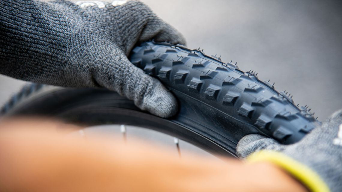 清潔で汚れのない場所で自転車のタイヤを取り外します。TLR自転車タイヤを交換する際、シーラントの滴が周囲の表面に飛び散る可能性があります。常に適切な保護具を使用してください。