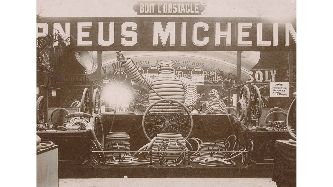 1894年、リヨンで開催された万国博覧会にミシュラン兄弟が訪れた時のこと。弟・エドワールは、ミシュラン社が自社ブースの入り口にタイヤを高く積み上げた展示を見て、ユニークなアイデアを思いつきました。「手足をつけたら人間に見えるじゃないか」!