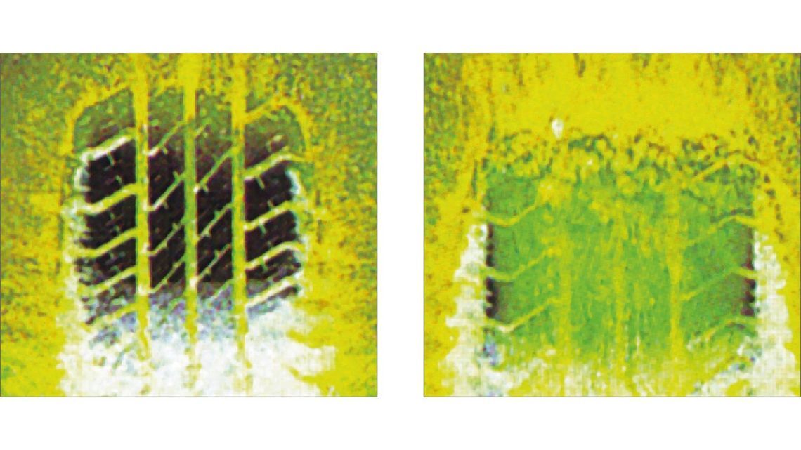 左:新品タイヤはしっかり排水している。 右:残溝1.6mmのタイヤは排水性が低下し接地面が水に浮いている。