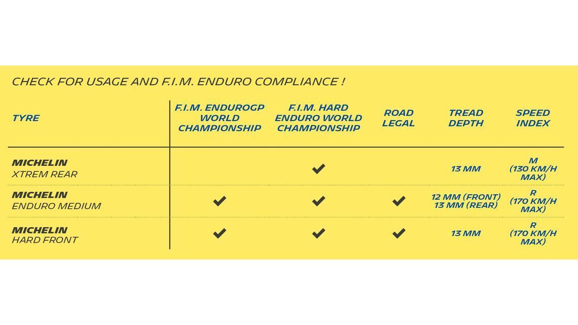 MICHELIN ENDURO MEDIUMとMICHELIN ENDURO HARDはどちらも公道走行可能で、上記のレギュレーションに適合しています。