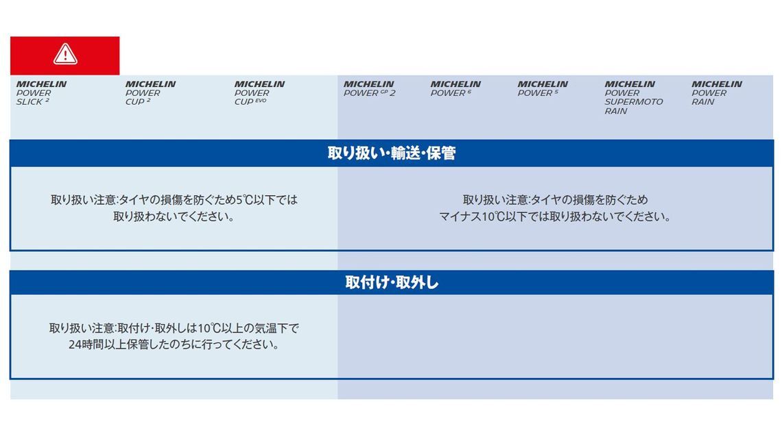 MICHELIN POWER SLICK 2、MICHELIN POWER CUP 2、MICHELIN POWER CUP EVOの取付け・取外しは、10℃以上の気温下で