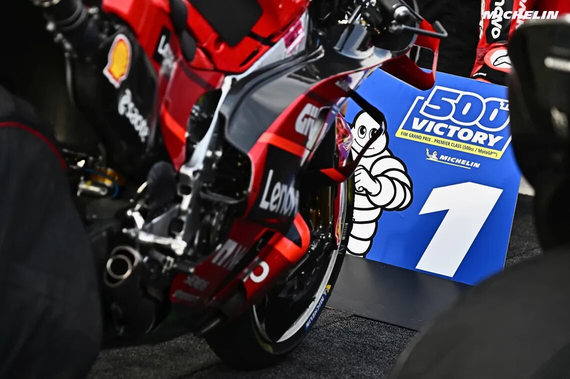 今シーズンの6勝目を飾ったバニャイアを中心に、写真左はミシュランモータースポーツ2輪マネージャーのピエロ・タラマッソ、写真右はミシュランのドゥカティ担当タイヤテクニシャンであるジャン‐クリストフ・カタラノ、そしてミシュランマン。予選は13位に沈んだバニャイアでしたが、良好なスタートを決めると、レース序盤のうちに表彰台圏内へ進出。残り8周となったところで首位に立つと、三つ巴のバトルを制して今季6勝目を獲得しました。これによりミシュランは、ロードレース世界選手権の最高峰クラスにおいて通算500勝目に到達。初優勝の1973年から2001年までの500ccクラスでは277勝、2002年以降のMotoGPクラスでは223勝という内訳です。
